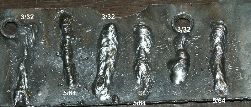 Too steep a rod angle, travel too fast and sometimes had long arc length causing spatter. The 3/32 (2.4mm) does cause the 12HP engine to bog a bit. The carb needs some adjustment. With some tweaking, it should run 1/8" (3.2mm) rods with no problem. A newer engine would probably do fine, this is at least 10 years old.