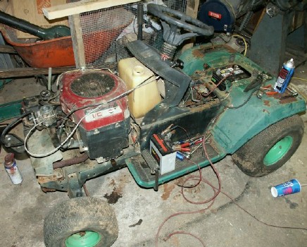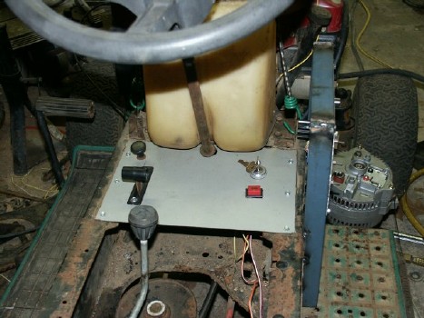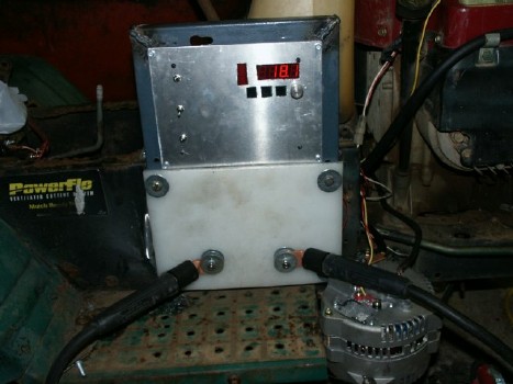Installed control board and an output terminals. The alternator is mounted to the right. Inside the mower frame are filter capacitors and a hand-wound reactor. |