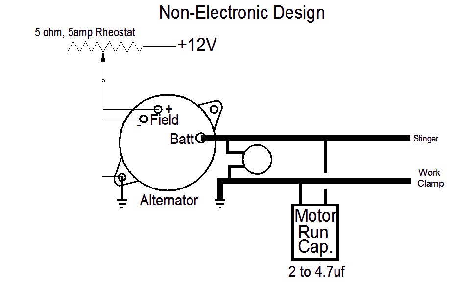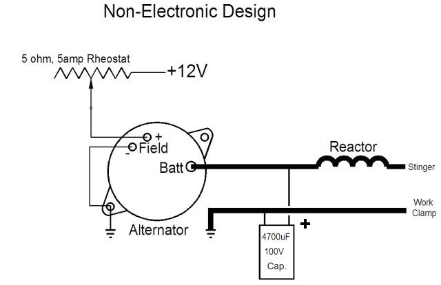 The 4700uf helps arc starting and maintains a more stable arc. It also protects the alternator diodes from spikes. This is a computer-grade, low ESR electrolytic cap, 4700uf at 100V (make sure polarity is right.) If you add a larger capacitor then the reactor is needed as the cap will mask the alternator inductance. 4700uF works well. I had 30,000uF and the arc started real easy but would just go out randomly. What was happening was the arc changed and the cap prevented the alternator from raising the voltage fast enough to compemnsate. I'd say 2200 to 10,000uF would be a good value. The 4700uF was a deal I found on ebay.